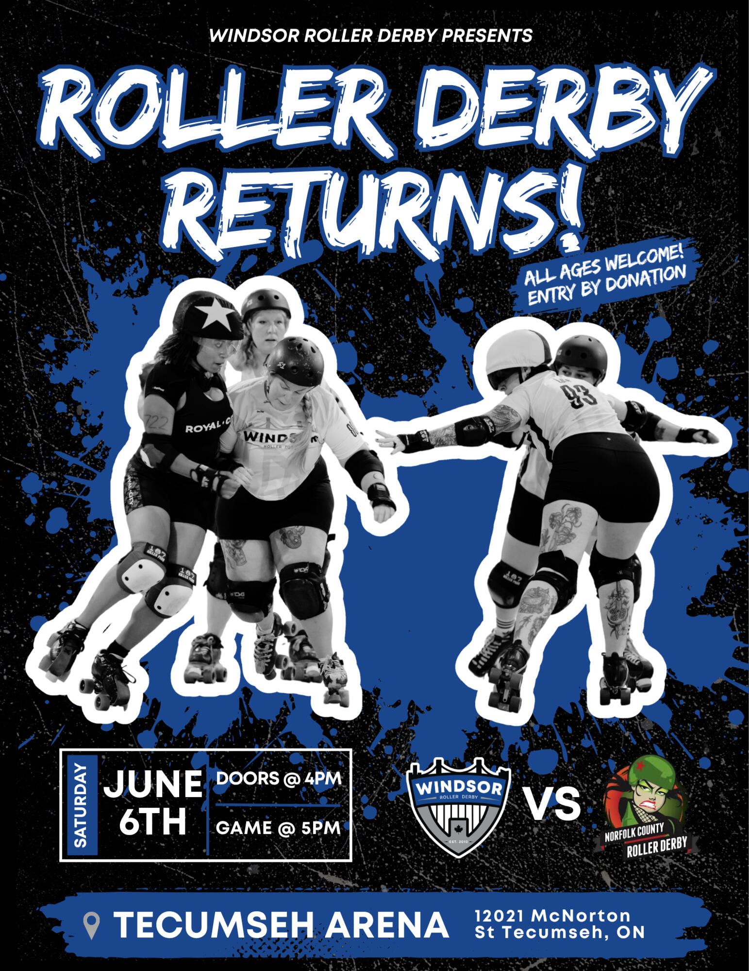 Join us for an exciting night of full-contact action on June 6 at Tecumseh Arena! After time away from the track, we’re back and ready to bring the energy.Doors open at 4:00 PM and the first whistle blows at 5:00 PM — arrive early to snag your spot!Entry is by donation (cash only at the door), helping us keep this event accessible for everyone.Free parking is available at the arena.All ages welcome — this is a family-friendly event.Trackside seating is available, but bringing your own chair is encouraged for the best view.Arena concession will be open with snacks and refreshments.WRD merch will be available — grab some gear and support the league!